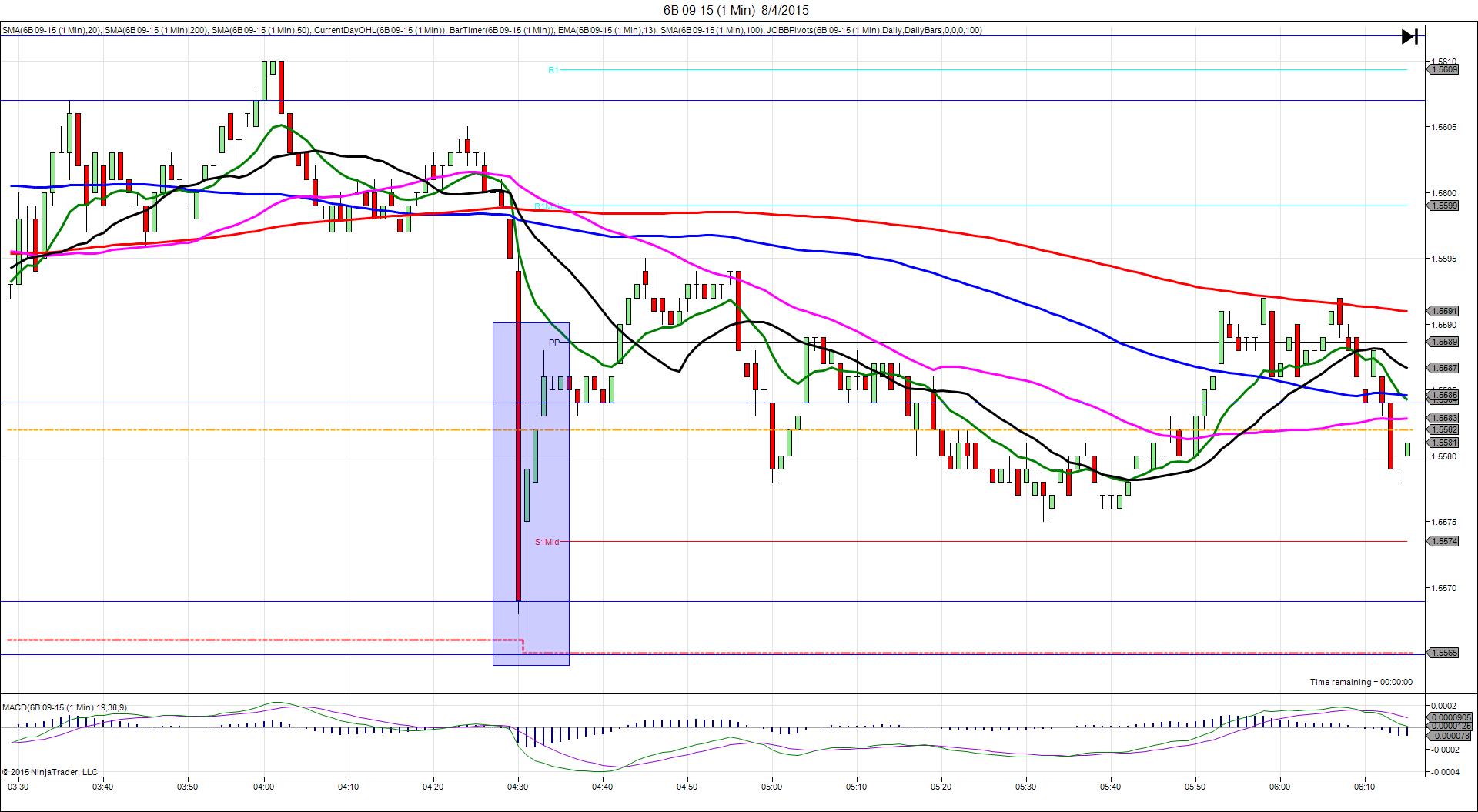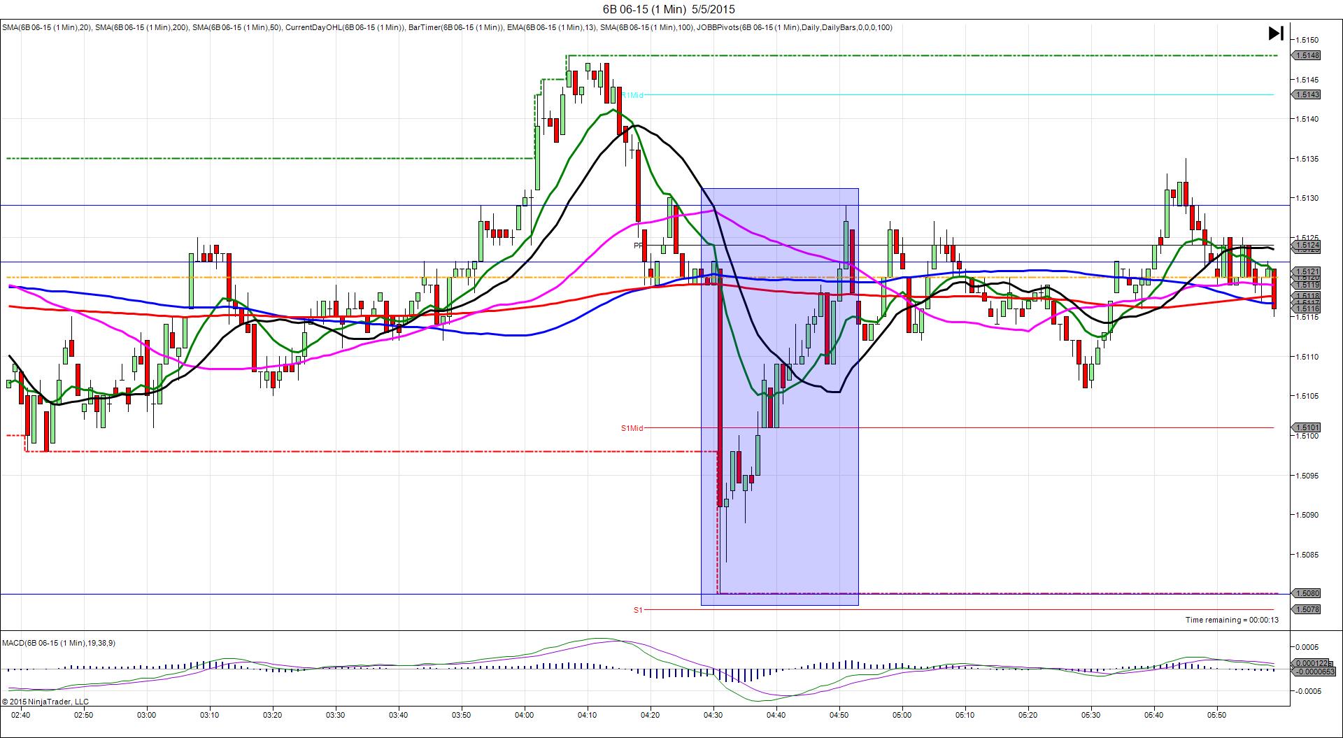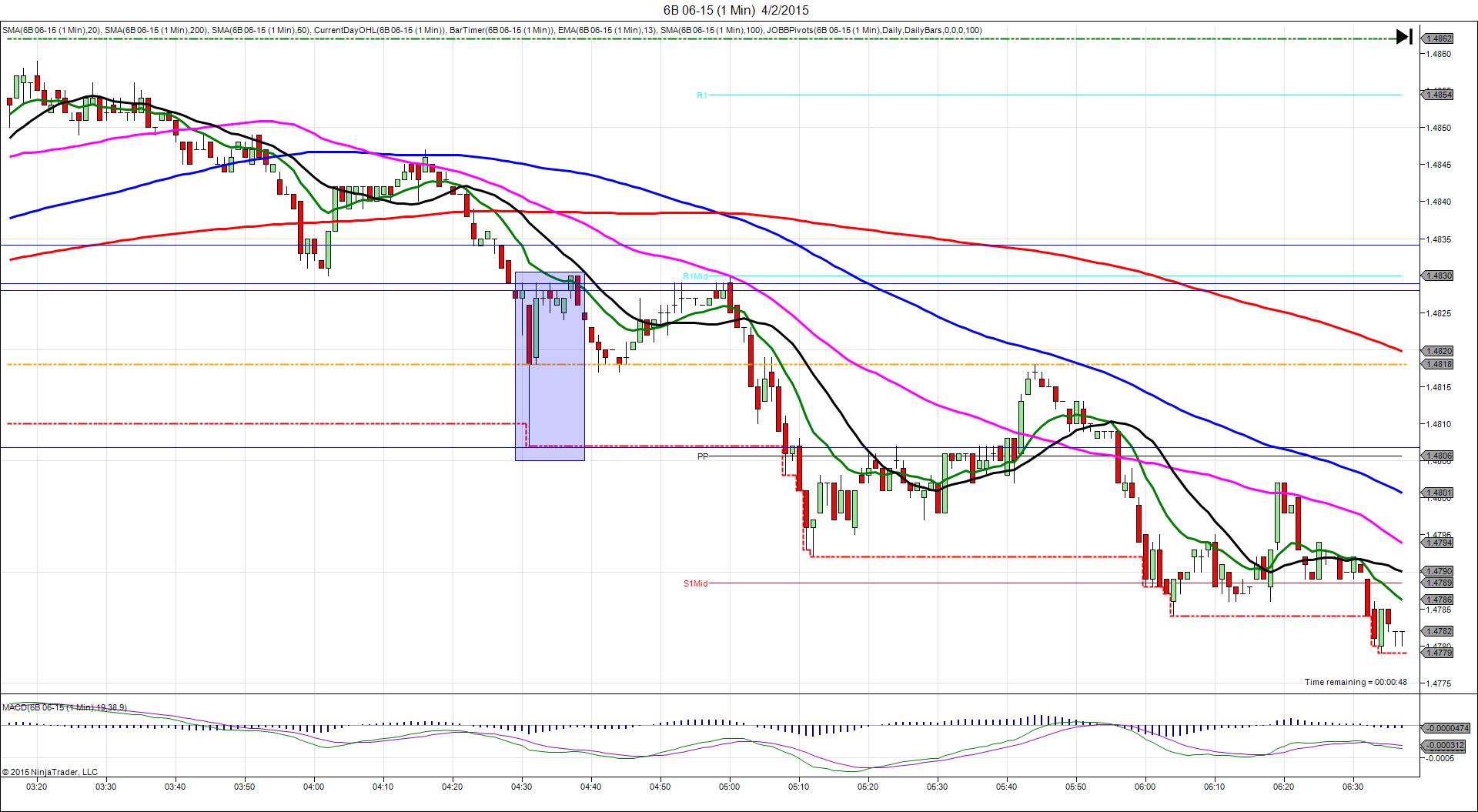 Notes: Report came in weaker than the forecast with 1.9 pts offset. This caused a quick short spike of 11 ticks that started on the R1 Mid Pivot and fell to reach the PP Pivot and extend the LOD in 1 sec. With JOBB and a 4 tick bracket, you would have filled short at 1.4819 with 5 ticks of slippage, then seen it settle and hover around 1.4812 for 5 sec to allow 7 ticks to be captured. After that it reversed 22 ticks in the next min back to the R1 Mid Pivot.