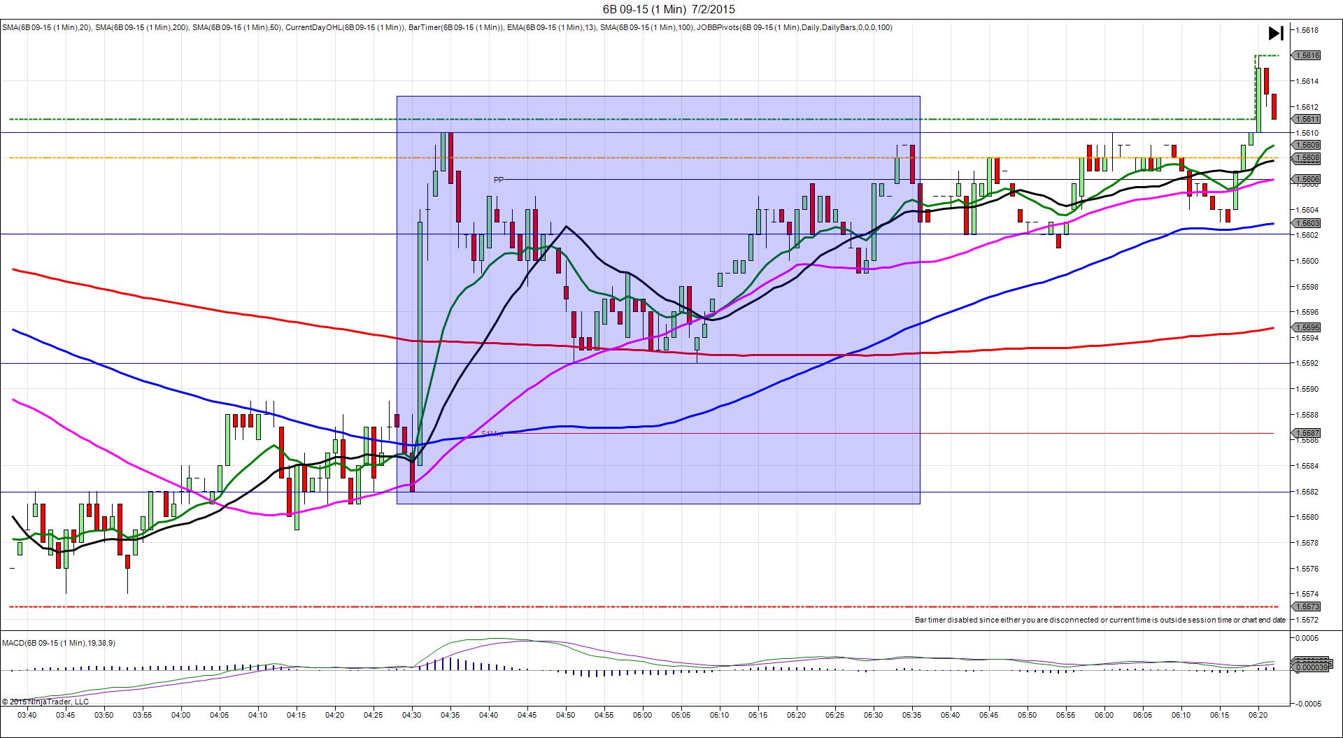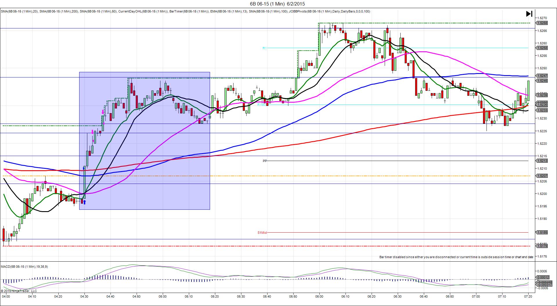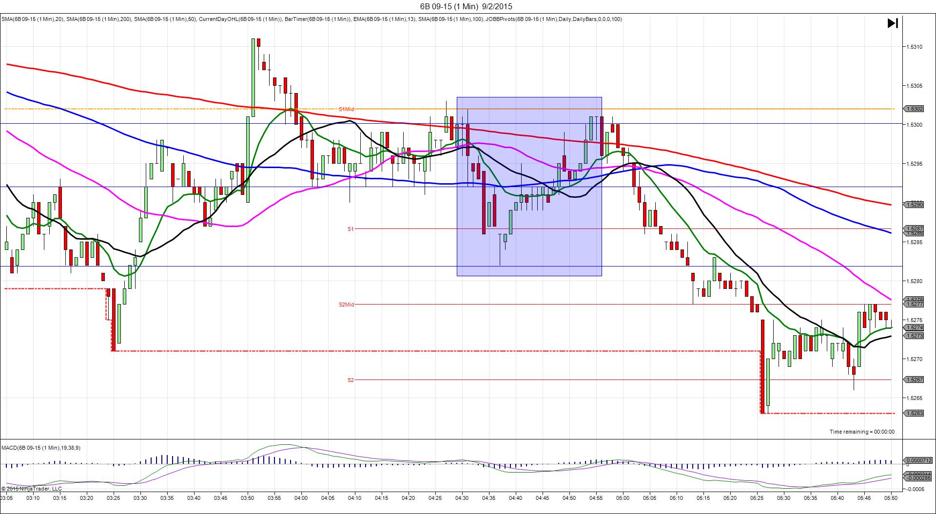 Notes: Report came in weaker than the forecast with 1.9 pts offset. This caused a quick short spike of 11 ticks that started on the R1 Mid Pivot and fell to reach the PP Pivot and extend the LOD in 1 sec. With JOBB and a 4 tick bracket, you would have filled short at 1.4819 with 5 ticks of slippage, then seen it settle and hover around 1.4812 for 5 sec to allow 7 ticks to be captured. After that it reversed 22 ticks in the next min back to the R1 Mid Pivot.